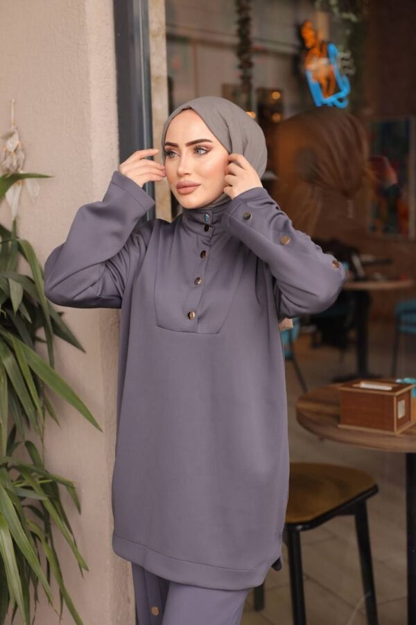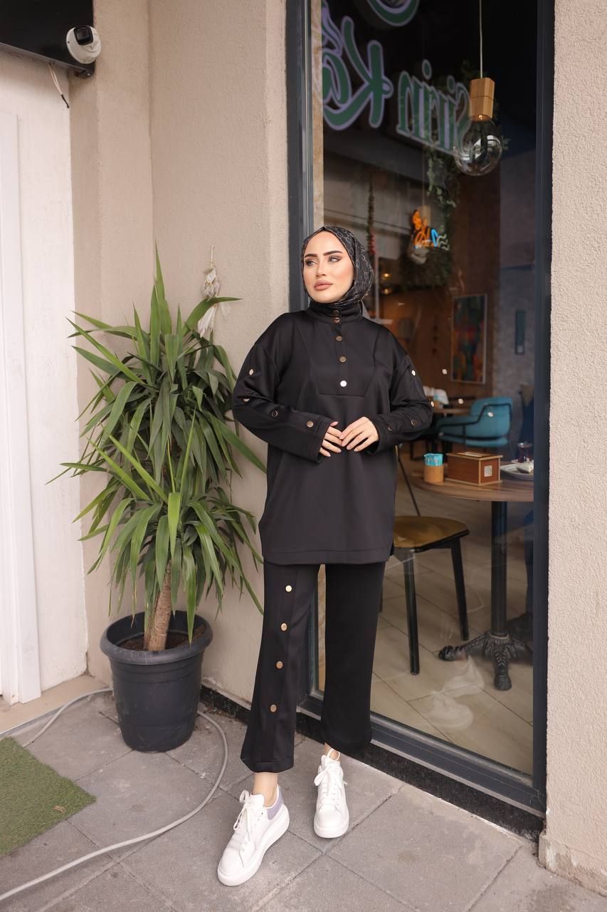 تأنقي مع طقم من قطعتين للمحجبات بتصميم سادة وأزرار ذهبية تعطلي لمسة أنيقة، يناسب كافة مقاسات الجسم | أحصلي عليه على الفور من متجر إليسار فاشون