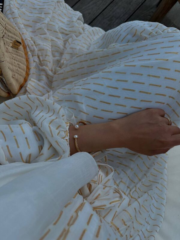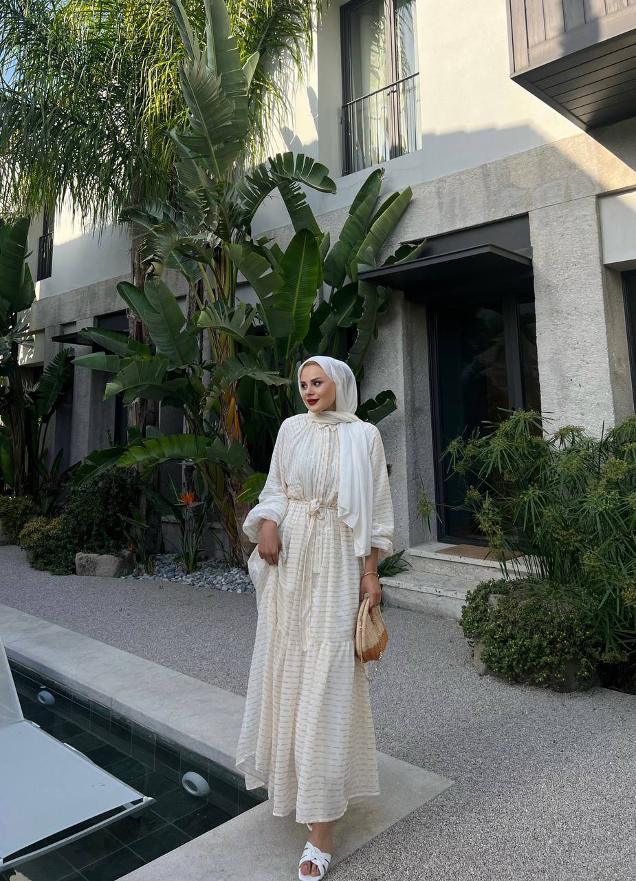 فستان مودرن باللون الأبيض بتصميم بسيط وناعم مع خطوط باللون الذهبي الرائع | تسوقي الأن عبر متجر إليسار بأسعار ليس لها مثيل