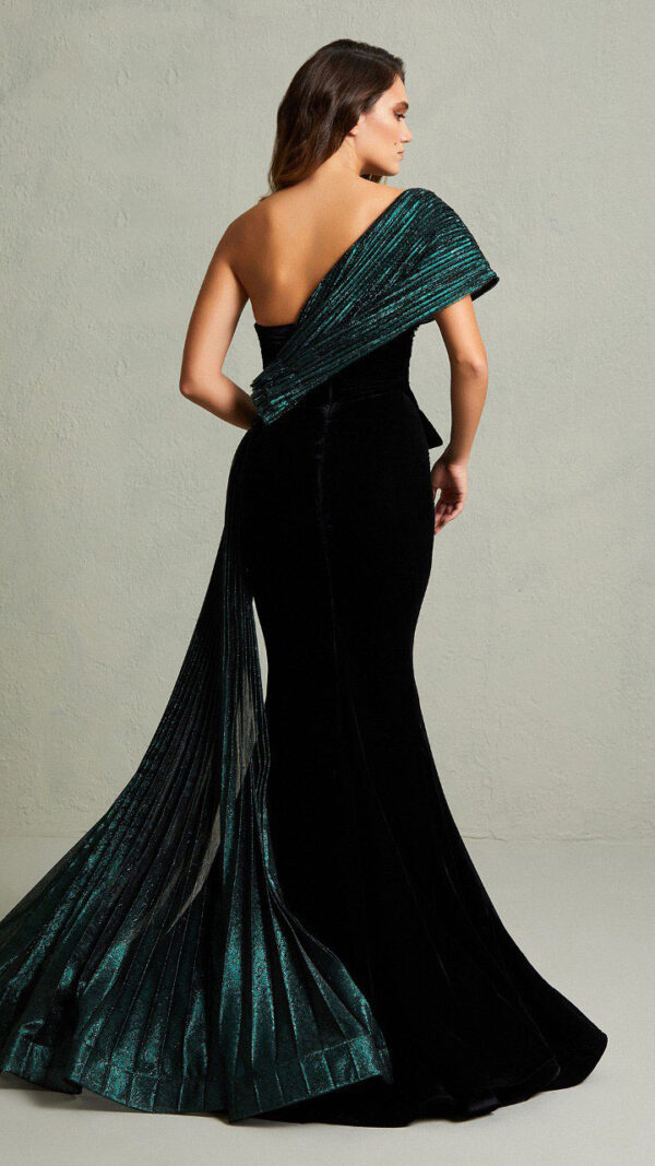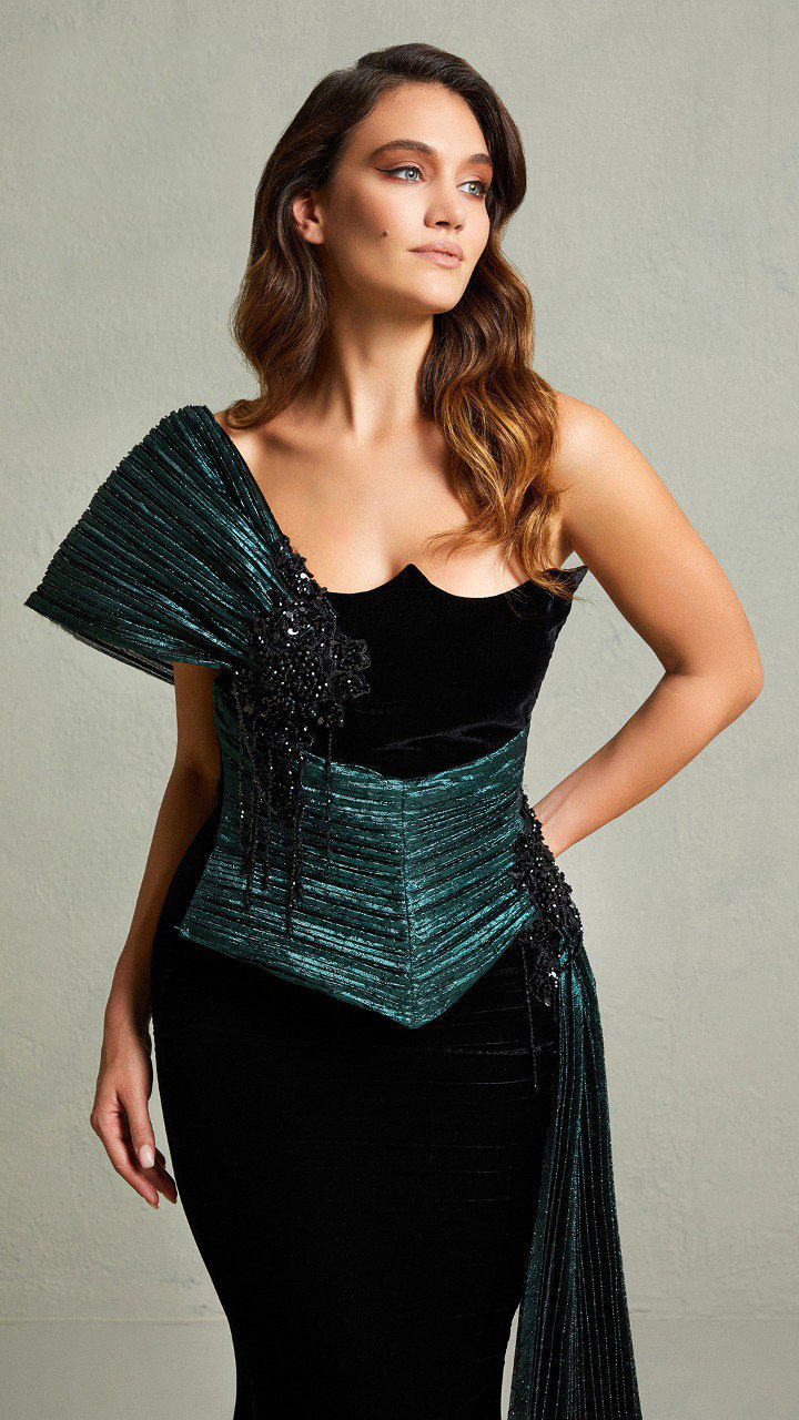 فستان طويل باللون الأسود من قماش القطيفة مطرز من الخصر والكتف مع ذيل طويل باللون الزيتي اللامع من أفضل فساتين السهرة | تسوق الآن من خلال متجر إليسار فاشون.