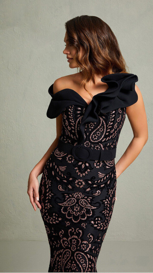 ستان أسود طويل مخيط بتطريز باللون الزهري بتصميم ضيق حتى أسفل الركبة مع نفشة بسيطة مميزة من الأسفل | اشتري المنتج الآن من إليسار